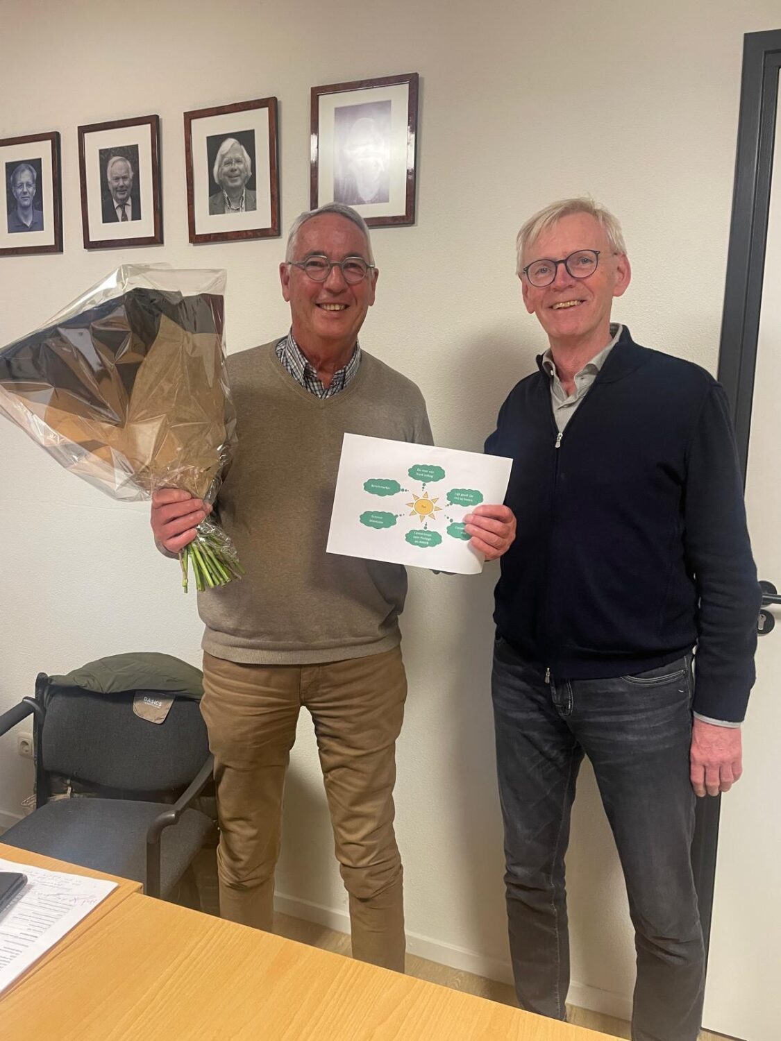 Ton is tijdens een commissievergadering even flink in het zonnetje gezet, getrakteerd op een heerlijke lemon pie en naar huis gegaan met een mooie bos bloemen die hij naderhand uiteraard wel moest inleveren bij zijn Roos.